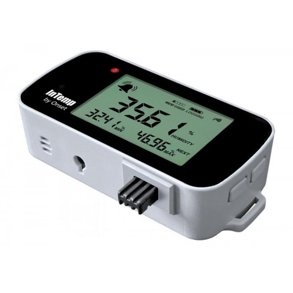 THE 'data recorder InTemp CX450 Temp/RH monitorear el temperatura y el'humedad dentro entornos de almacenamiento y transporte con una sensor externa alta precisión.